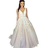 ABaowedding Women’s Wedding Dress for Bride Lace Applique Evening Dress V Neck Straps Ball Gowns