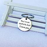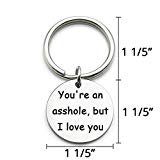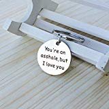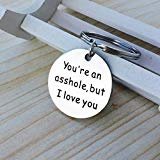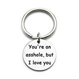 - FUNNY COUPLE KEYCHAIN: Engraved with “You’re an asshole, but I love you”. Romantic gifts for him.